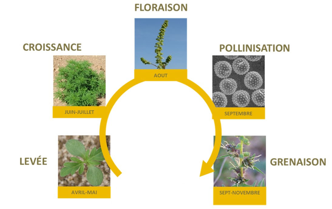 Son pollen est très allergisant, il suffit de quelques grains de pollen par mètre cube d’air pour que les symptômes apparaissent. 6 à 12 % de la population exposée sont allergiques à l’ambroisie. Depuis environ 20 ans, elle est en pleine expansion et colonise une grande partie de la France. Les pollens sont libérés d’août à septembre avec généralement un pic vers la mi-août.